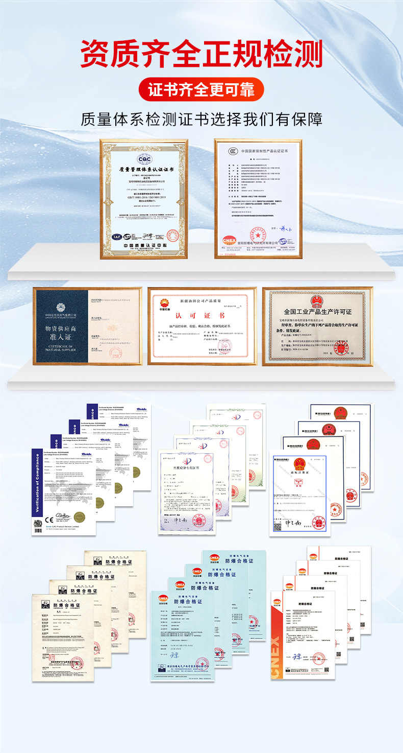 寶雞市新翔石油電控設(shè)備有限責(zé)任公司主要從事防爆產(chǎn)品的研發(fā)和制造,適用于石油、礦井、國防、電力等領(lǐng)域。公司設(shè)備先進(jìn)、技術(shù)力量雄厚,集科研、生產(chǎn)于一體,有相當(dāng)規(guī)模和水平的制造體系,并且嚴(yán)把質(zhì)量關(guān),己通過ISO9001質(zhì)量體系認(rèn)證。